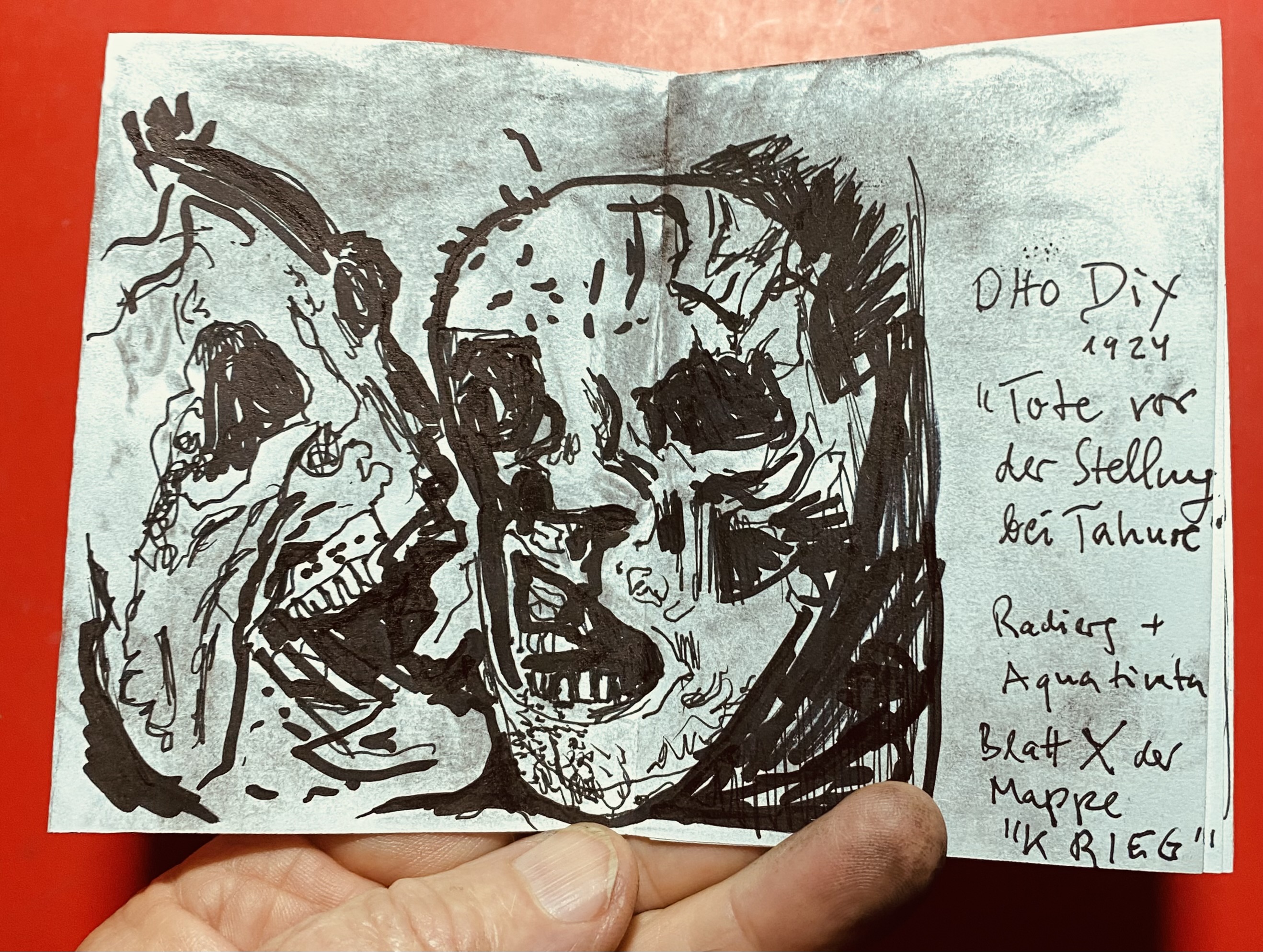 Die folgende Doppelseite zeigt den größten Teil einer Radierung von Otto Dix, Bild X aus seinem Zyklus „Krieg“ (1924).
