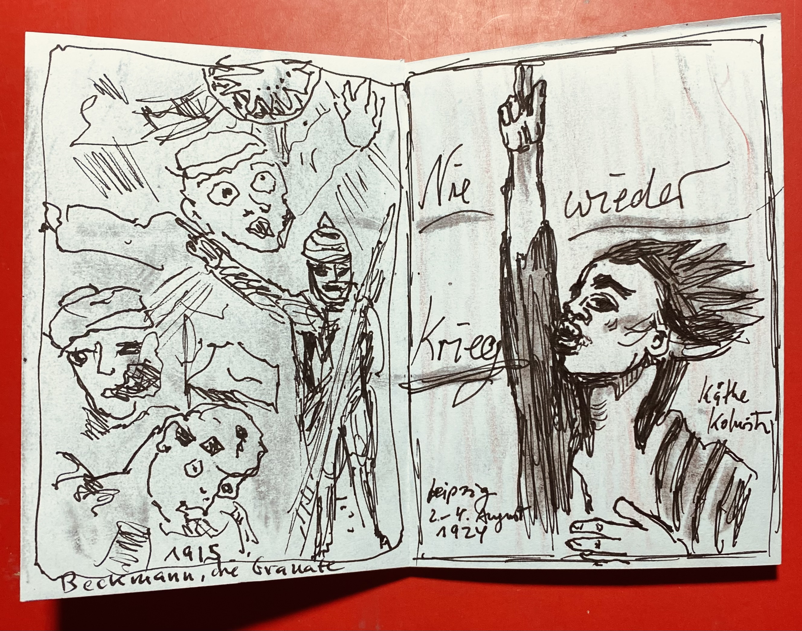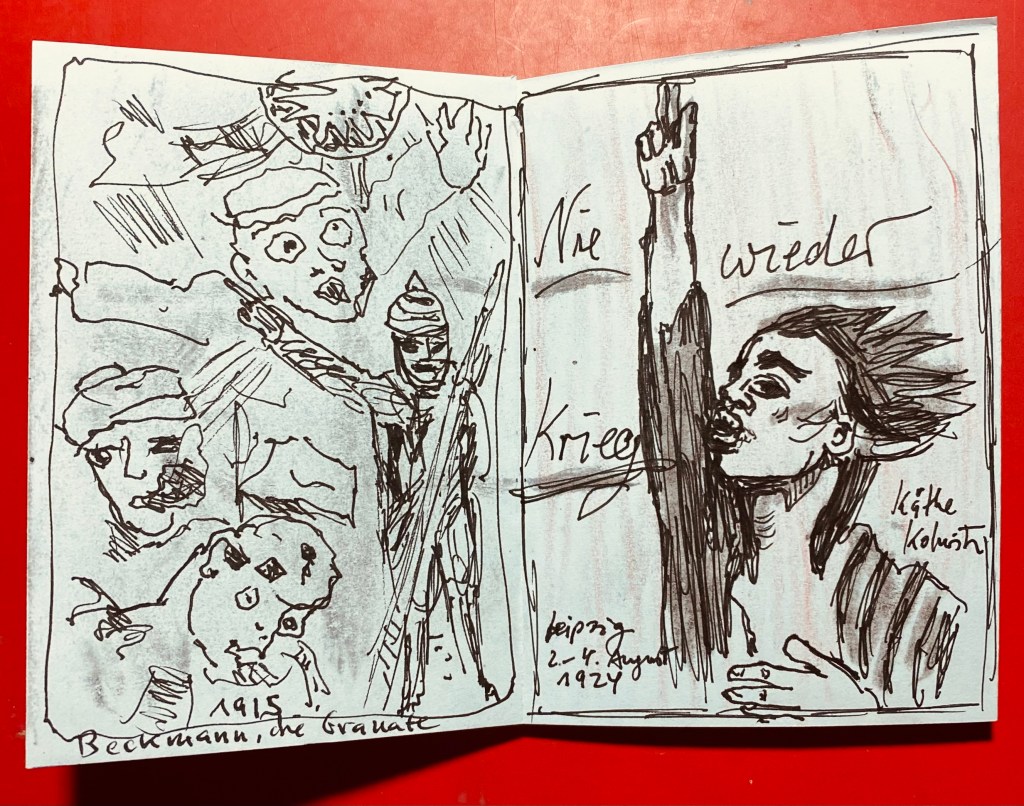 Es folgt ein Ausschnitt der Radierung „Die Granate“ von Max Beckmann aus dem Jahre 1915. Auf der gegenüberliegenden Seite dann das titelgebende Plakat von Käthe Kolwitz „Nie wieder Krieg“ ((1924).