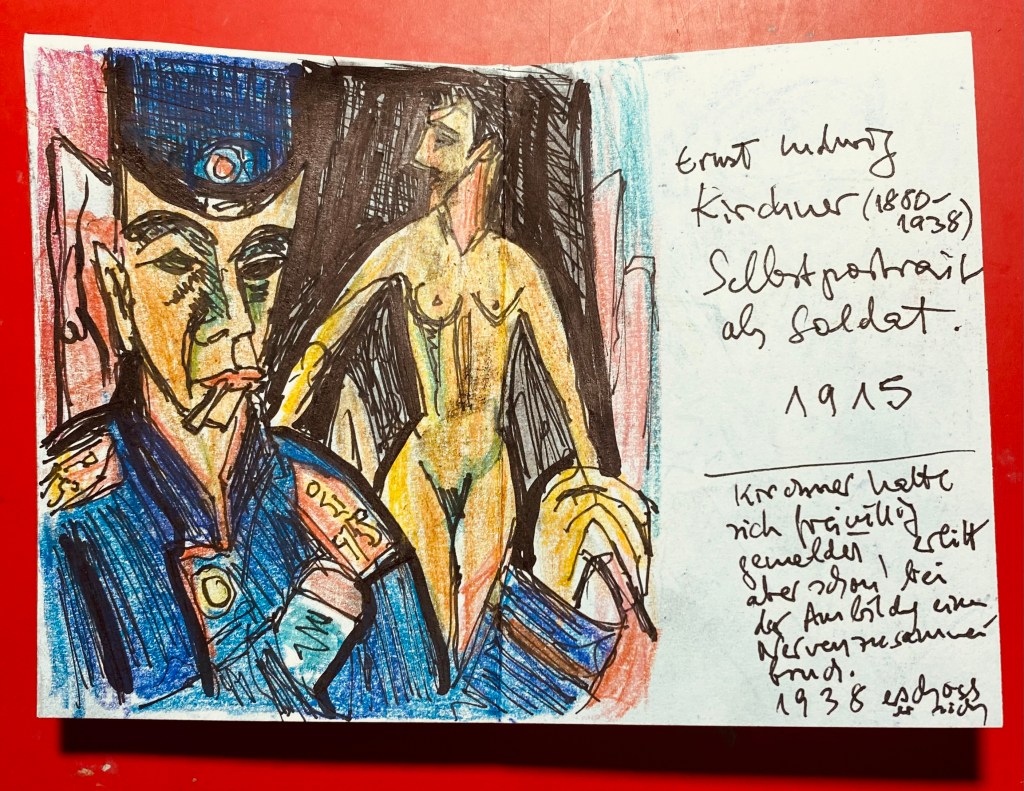 Die nächste Doppelseite zeigt ein Selbstporträt von Ernst Ludwig Kirchner, der sich 1914 freiwillig zum Wehrdienst meldete, aber schon bald einen Nervenzusammenbruch erlitt. 1938 erschoss er sich wegen der Diskriminierung seiner Kunst.