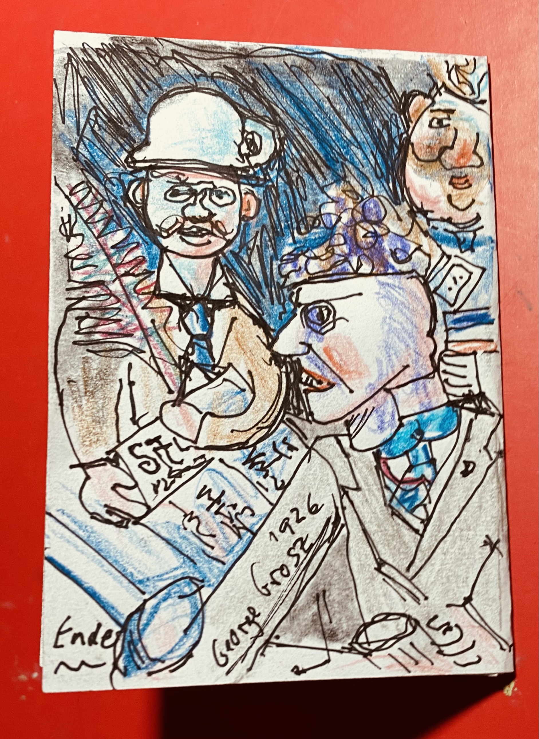Die Rückseite zeigt einen Ausschnitt eines Gemäldes on George Grosz mit dem Titel „Die Säulen der Gesellschaft“ (1926).