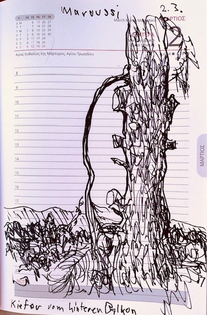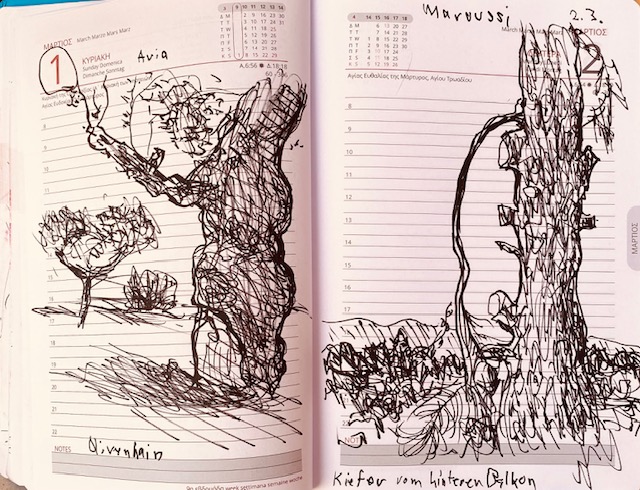 Heute, am 2. 3., zeichnete ich, auf dem Balkon unserer Athener Wohnung sitzend, den Stamm der riesigen Pinie, die auf dem Grundstück der Nachbarn steht. Die Äste entlang des Stamms sind zum großen Teil abgesägt. Nur ein langer Ast zeigt wie trauernd nach unten. In der Ferne wird waldiges Gebiet sichtbar, dahinter die Ausläufer des Parnitha-Gebirges, das von hier aus flach wirkt, dessen höchster Gipfel, der Karambola, aber 1.413 Meter erreicht.