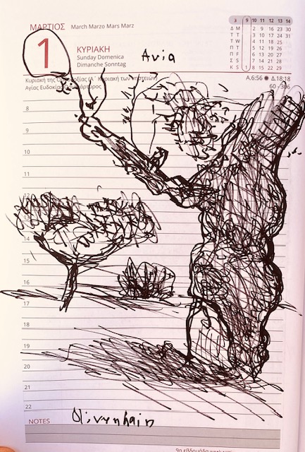Am 1. März zeichnete ich einen dicken runden Olivenbaumstamm mit einem Ast, der hinausweist ins weite Land. Ein kleinerer Olivenbaum und ein Busch grüßen freundlich zurück.