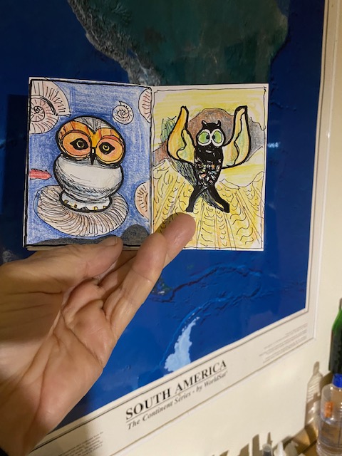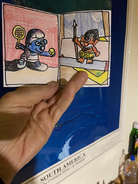 Die Zeichnungen habe ich wegen des dunklen Blaus vor der großen Landkarte Südamerikas fotografiert, die an der Küchenwand hängt.