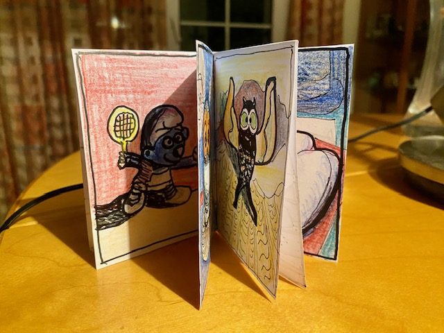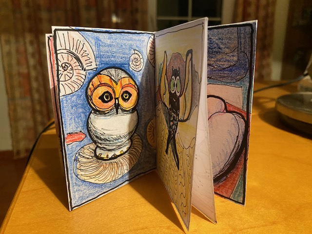 Morgen treffe ich meinen Schützling C und ihre inzwischen 4 jährige Tochter. Und da dachte ich, ich mache ihr ein Minizine zum Geschenk. Als Thema wählte ich Figürchen und sonstigen Krimskrams, die sich auf meinem Schreibtisch hier in Maroussi herumtreiben. Als Hintergründe benutzte ich Bücher, Postkarten und ein Zeichenbuch, die sich auf dem Schreibtisch türmen.