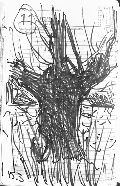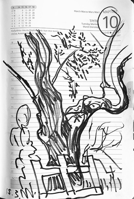 (7) Anschließend begab ich mich ins beliebte Garten-Cafe „Stolidi“ und setzte mich in die Sonne. Aus den Lautsprechern ertönte eine angenehme Bar-Musik. Bevor meine Bestellung kam, zeichnete ich zwei Besucher am Nachbartisch, die mir den Rücken zuwandten und mit einem Dritten sprachen. Ich ärgerte mich, dass ich mein Kalenderbuch nicht dabei hatte, die letzten Seiten sind noch leer.