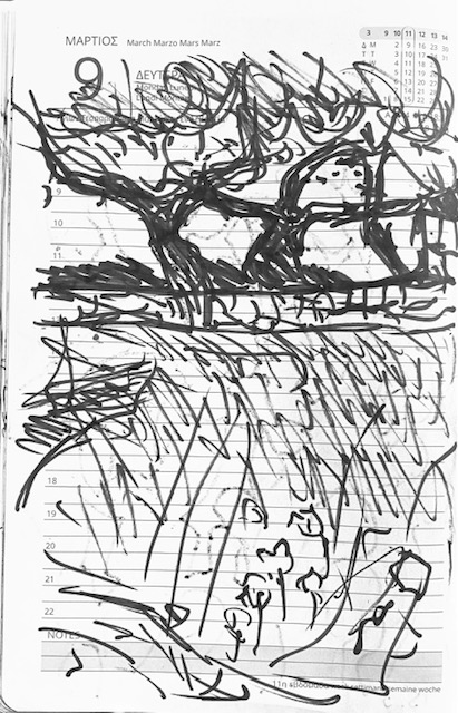 (4) Dann ging ich #Fühlingszeichnen26, das @annenilges organisiert, und beruhigte mich dabei einigermaßen. Ich ging im zuvor etwas aufgeräumten Garten herum und zeichnete anweisungsgemäß auf das Leporello aus Zeichenpappe zuerst mit breitem gelbem Leuchtstift, was mir der Boden an Impulsen gab, dann mit Fineliner das, was ich im Hinaufschauen bemerkte, und schließlich mit rotem Buntstift das Naheliegende.