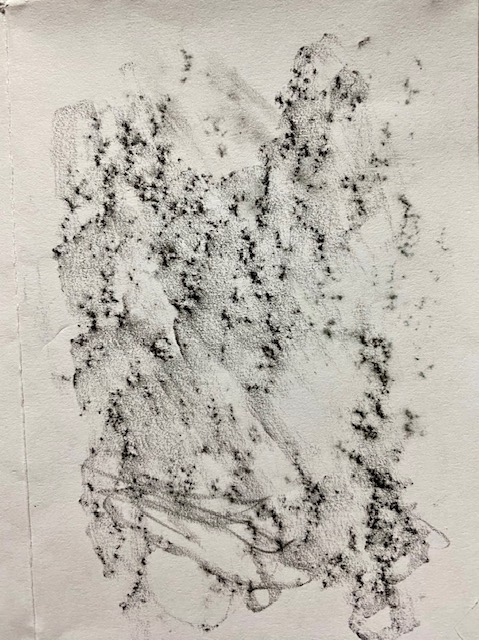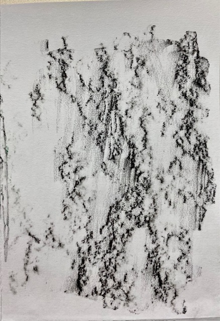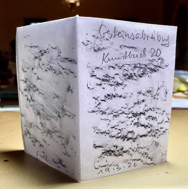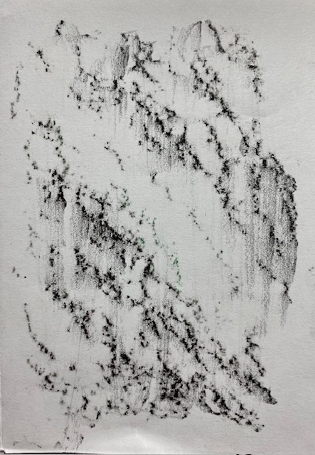 Ich lebe in einem Haus, das aus Naturstein geschichtet und gemauert wurde. Ein paar dieser schönen Steine beschloss ich, in einem Mini-Zine „abzureiben“, dh die Unebenheiten mit einem weichen Bleistift durch ein Papier zu reiben („Frottage“-Methode). Sichtbar wurden feinste Strukturen – die, so will mir scheinen, eine heimliche Notenschrift darstellen. Wer sie entziffert, wird den Gesang der Steine vernehmen.