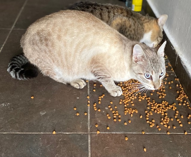 Weniger begeistert ist Fritzi, die ihre Alleinherrschaft im Haus genossen hatte und ungehalten ist. Als ich sie streichelte, biss sie mir sogar leicht in den Finger. Sie geht umher und „wedelt“ ärgerlich mit dem Schwanz. Jetzt sitzt sie auf dem Hocker und putzt sich, anstatt auf ihrem gewohnten Platz auf dem Schreibtisch zu liegen. Tja.
