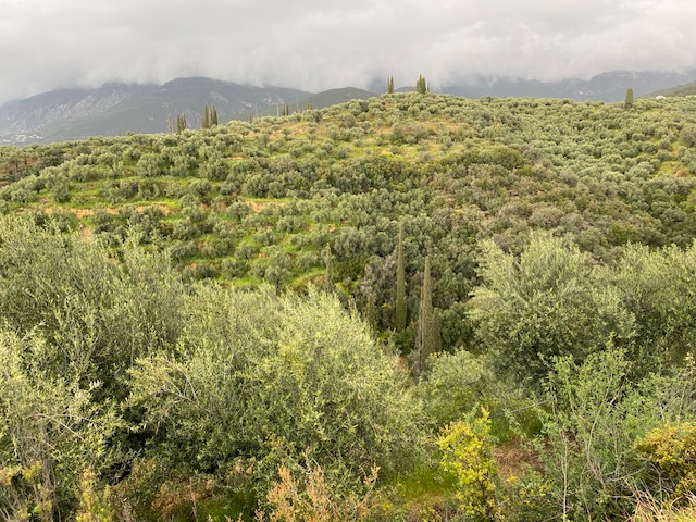 Ich kletterte hinauf und hatte während der Überführung ans andere Ende Kalamatas Zeit, die Künste des Fahrers zu bewundern, der mit dem Riesending fuhr, als sei es ein Motorrad. Auch die Landschaft war von meinem hohen Sitz aus sehr eindrucksvoll, zumal es wieder Neuschnee auf den Berggipfeln zu bewundern gab.