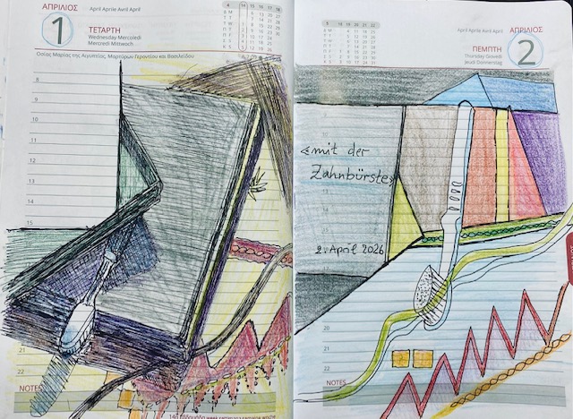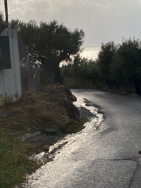 Noch dies und jenes kaufte ich und fand meinen Mann auch bei der Taverne Thiassos, die freilich geschlossen war. Also beschlossen wir, erstmal bei der Freundin vorbeizufahren, um ihr das Mini-Zine und die Blume zu bringen. Sie war nicht da, aber ihre Schwiegermutter und die drei Mitarbeitenden der kleinen Produktion von Marmeladen etc, die sie betreibt. Alle fingen an zu weinen, als sie das Heftchen sahen.