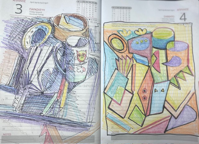 Am Wochenmarkt kaufte ich eine kleine blau blühende Topfpflanze, um sie mitsamt dem Kunstbuch „Luna“ der Freundin zu bringen, die heute ihren Hund begrub. Dann machte ich einen Bummel zum „Koukouvagaki“, der „kleinen Eule“, einem Laden mit Antiquitäten der alltäglichen Art: Die Erben brauchen es nicht mehr, Freundin Maria sammelt es und bietet es zum Verkauf an. Auch einige meiner Tierbilder hütet sie, um sie für den Tierschutzverein zu verkaufen. Seit langem schon wollte ich vorbeigehen. Ich traf sie an, besah mir ihr zweites Ladengeschäft, das sie nun dazugemietet hat, fotografierte eine Ansammlung fein bemalter Tassen und zog glücklich mit einem geschenkten Eulen-Rucksack ab.