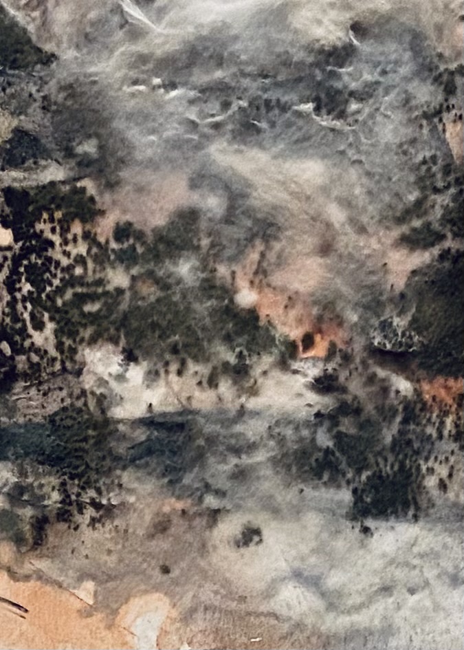 Betrachtet man die gestern gezeigten „blühenden Bilder“ von Nahem, schauen einen geistergleich Gesichter an, und qualmende Brände steigen aus den Tiefen empor, als solle die Welt in Rauch und Flammen aufgehen.