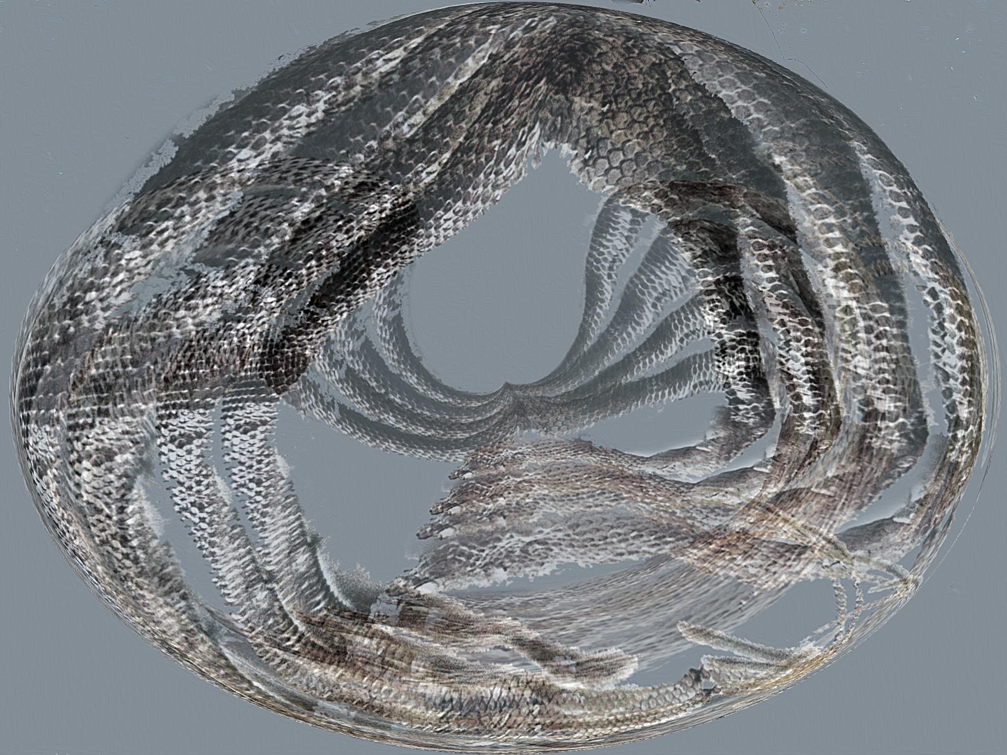 Die Schlange, die ihr hier seht, fand ich in meinem Atelier, als ich nach längerer Abwesenheit die Tür öffnete. Sie lag am Boden, schwarz, starr. Vorsichtig hob ich sie auf. Ja, sie war tot. Vielleicht verdurstet. Oder meine Farben waren ihr nicht bekommen.