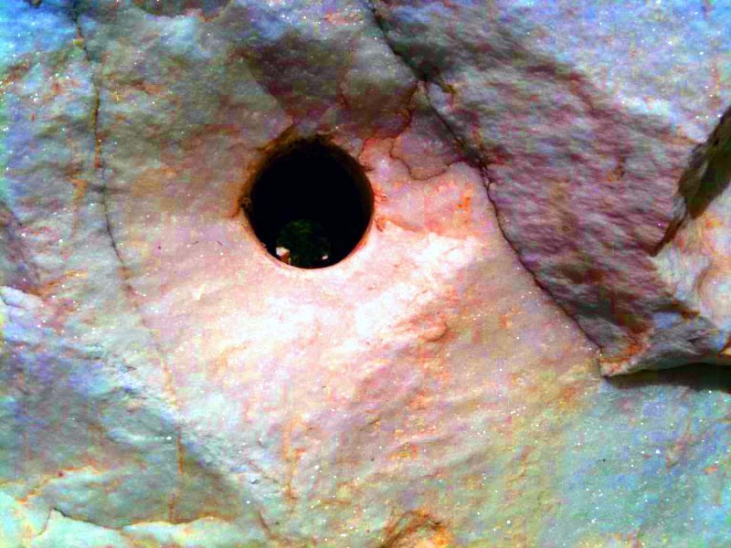 Die kreisrunden Sprenglöcher sehen, besonders wenn man die Farben ein wenig verstärkt, aus wie blutunterlaufende Augen. Ich möchte annehmen, dass der Grund dafür die mineralischen Beimischungen im Gestein sind und nicht der Schmerz, den die Bergin Penteli empfindet, wenn man ihr die Knochen bricht.