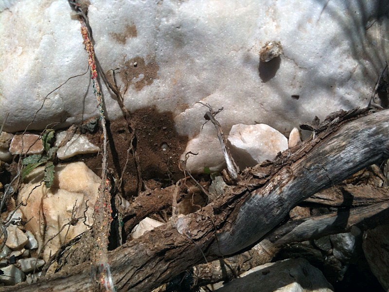 Andere einstmals flüssige Gesteine begleiten den Marmor, Wurzeln sprengen ihn auf.