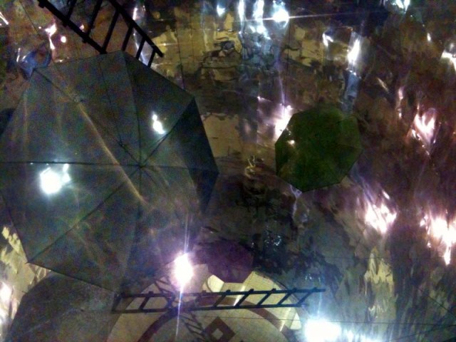 Im Lichtschacht der Metro hängen sie auch, die Schirme, und freischwebende Leitern gibt es, die mich an die wunderbare Geschichte „Das Lächeln am Fuße der Leiter“ von Henry Miller erinnern. Eine meiner Lieblingsgeschichten, nebenbei bemerkt.