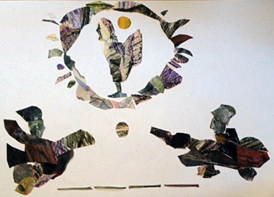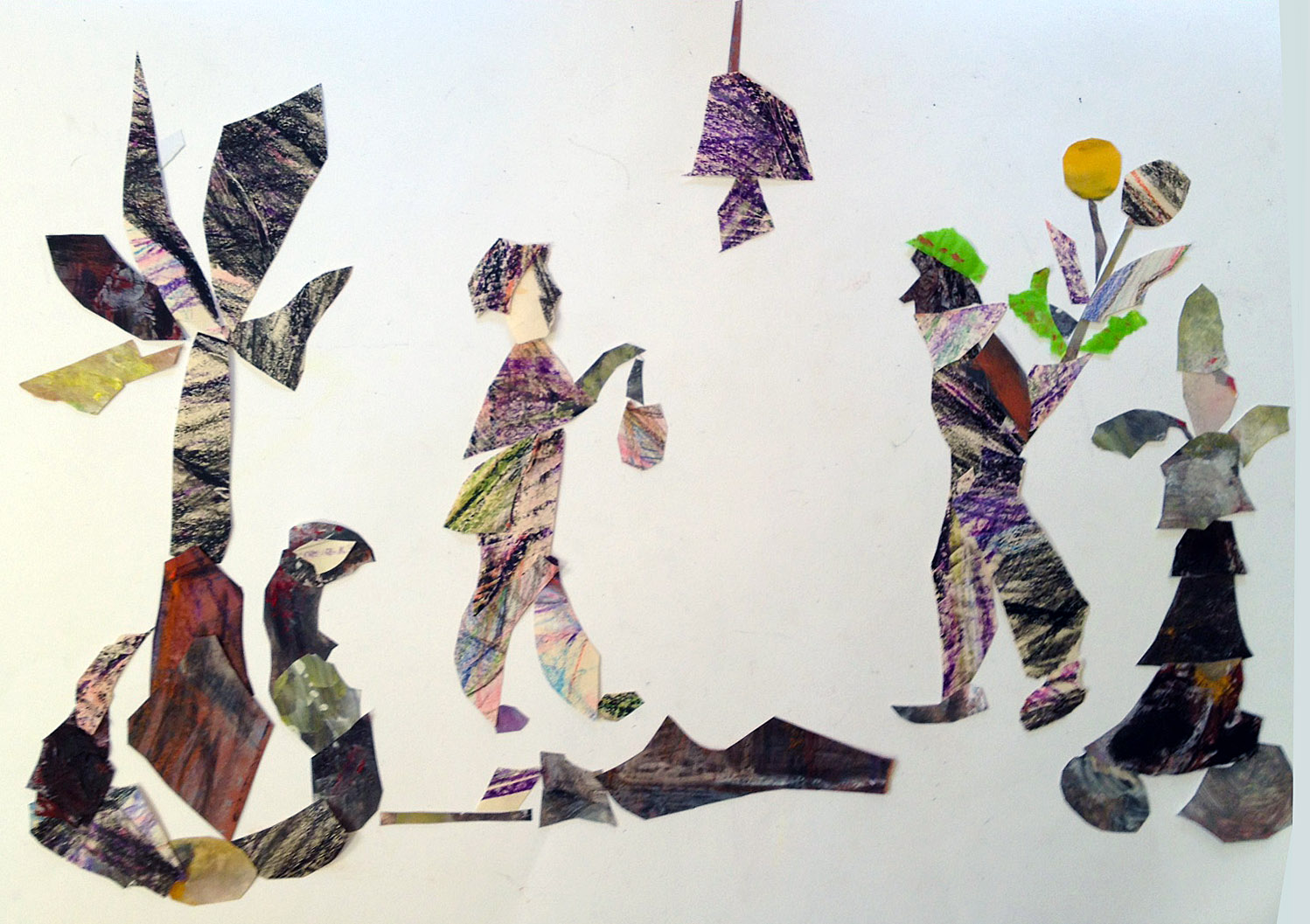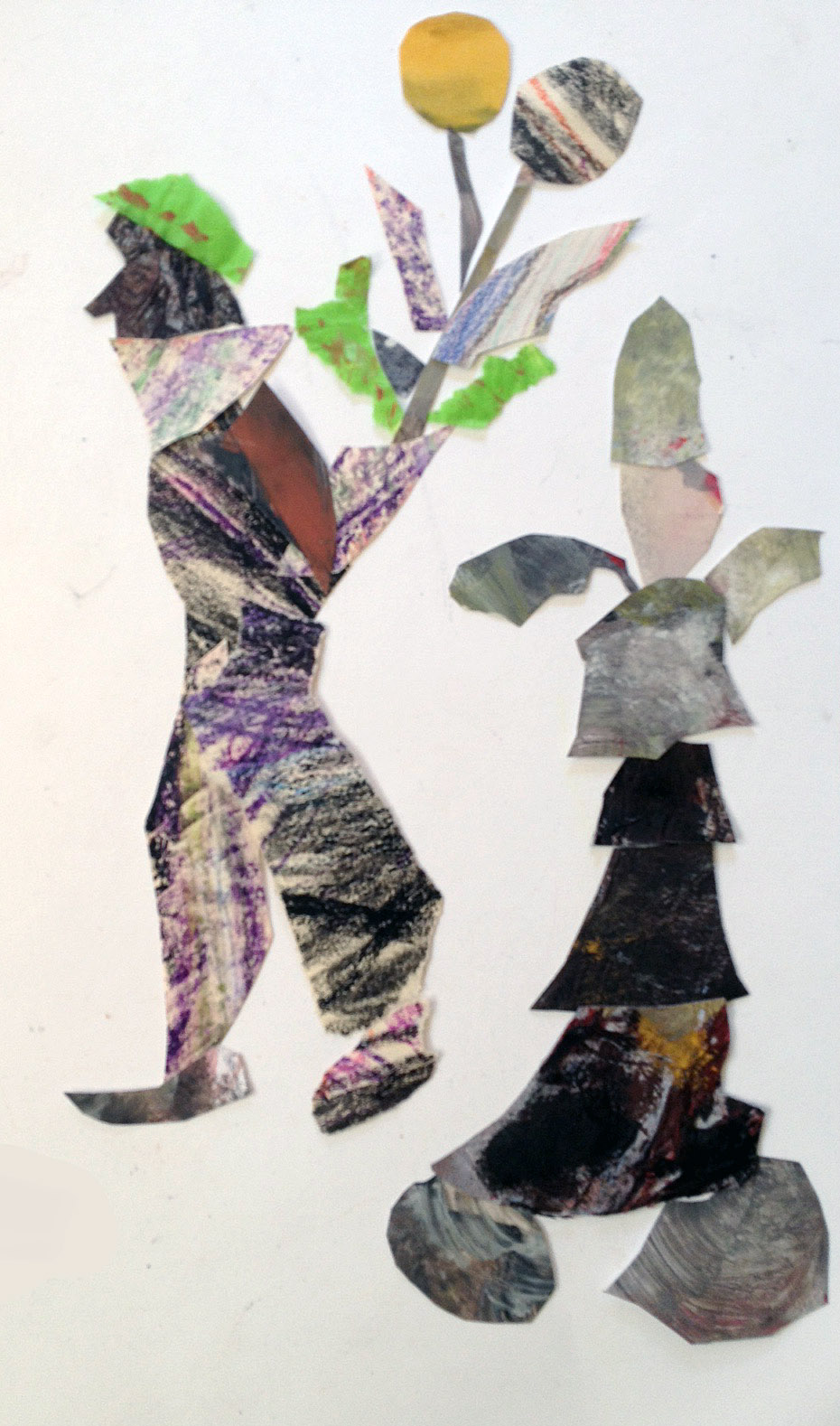 Ps. Es sind dieselben Schnipsel, aus denen diese  beiden Bilder entstanden sind, nur das Grün habe ich rechts hinzugefügt. Dieselben Schnipsel verwendete ich auch für das gestrige Bild „Trauer“. Dieselben Schnipsel plus ein paar weitere nahm ich auch für „Herr Winter kommt nicht mehr“ und für sämtliche Bilder zu Juttas geschichtengenerator, veröffentlicht in der letzten Woche. Aus demselben Material lässt sich eben vieles formen. Nicht auf das Material kommt es an, sondern auf den Geist, der es formt. Wie im echten Leben.