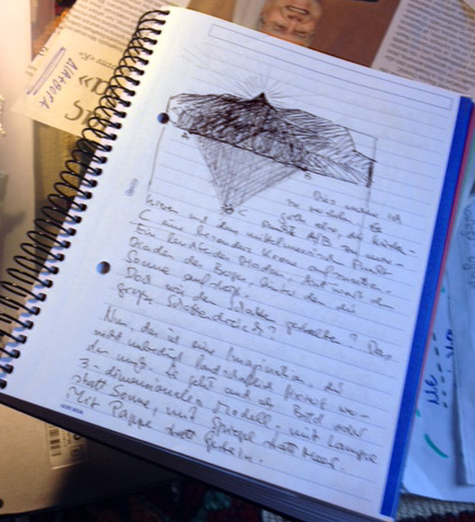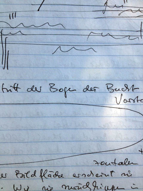 „Helen schlug mir vor, ganz konzentriert auf das Wesentliche, das heißt auf das, was ich denke, zu skizzieren.“ Und so schrieb ich damals, in ihrem Haus, auf, was ich mir als Kunstprojekt vorstellte „in unserem Olivenland“, daheim in der Mani. Und sann über den „Bogen der Bucht“ nach – „Vorstellung der Fläche in der Horizontalen. … Der Bogen ist durch die Küste gebildet. Ohne Intervention der Küste würde sich das Blau in einer unendlichen Fläche ausdehnen, deren scheinbare Grenzen kreisförmig wären, in der Mitte mein Blick. Der Horizont als Grenze des Sehfeldes. – Doch tatsächlich verriegelt das Gebirge die Fläche, deren Fortsetzung nur zu erträumen ist. Wenn ich den Gipfel ersteige, weitet sich der Blick erneut, greift über den horizontalen Kreis hinaus. – Ich denke an den gewaltigen Dreiecksschatten, der auf das Meer fällt, wenn die Sonne hinter der Pyramide, dem Hauptgipfel des Taygetos, aufgeht. ….“