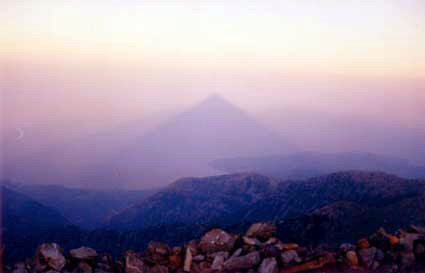 Hier nun ein Foto des Schattens, den der höchste Gipfel des Taygetos-Gebirges an seltenen Tagen, bei Sonnenaufgang, auf die Bucht von Kalamata wirft. Man kann ihn nur vom Gipfel aus sehen. (Es ist leider nicht mein Foto, denn ich kann nicht mehr hinaufsteigen, und ich weiß auch nicht, wer es aufgenommen hat).