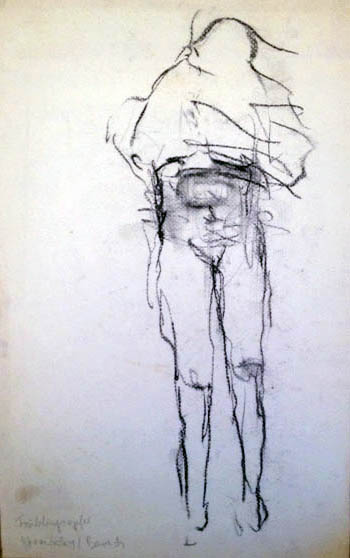 Aber ich habe bei meiner Aufräumerei eine kleine Bleistiftskizze gefunden, die ich sehr mag. Ich machte sie vor Jahren, tief bewegt durch Bina Bausch im Sacre du Printemps von Igor Stravinski. Ich fühle meine damalige Betroffenheit noch heute nachzittern in dieser Kohleskizze.