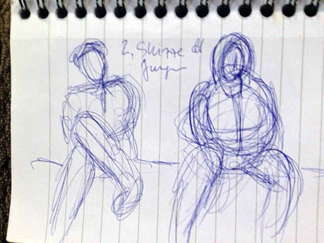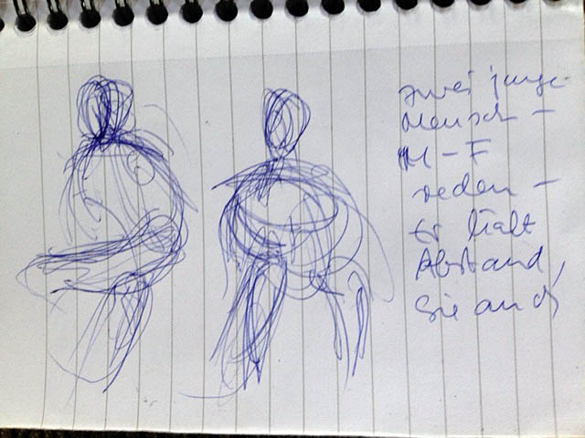 Mein erster Versuch: zwei junge Menschen sitzen auf einer Bank. Offensichtlich kennen sie sich, sie reden, aber sie kommunizieren nicht miteiander. Der junge Mann (M) schaut geradeaus, hält seinen Kopf aber nach links geneigt, und sein übergeschlagenes Bein wirkt als Barriere. Die junge Frau (F) sitzt locker, frontal, in sich gesammelt und schaut abwechselnd geradeaus und auf ihr Handy. M behält in der zweiten Skizze die Abwendung des Kopfes und der Schultern bei, wechselt nur die Beinhaltung. In der dritten Skizze schauen beide gleichzeitig nach links, als würden sie jemanden erwarten, der sie endlich aus ihrer unbequemen Gemeinsamkeit befreit.
