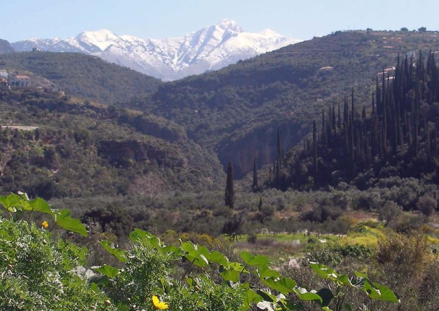 Einen Blick auf den Taygetos im Schnee – gesehen vom Eingang der Sandova-Schlucht aus – möchte ich euch als zweiten Gang servieren. Ich habe es an einem 10. März aufgenommen, in einem anderen Jahr. Schnee hat das Gebirge auch jetzt, aber weniger eindrucksvoll. Es ist schon zu viel abgetaut. Grad jetzt zieht sich ein Unwetter zusammen. Vielleicht gibt es Neuschnee?