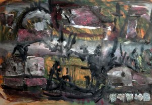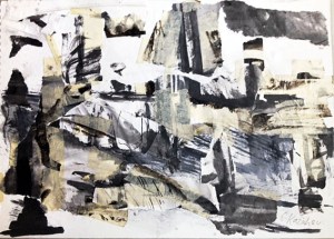 Ich nahm dann eine mehr strukturierte, schwarz-weiß-gelbliche Arbeit, die ich ganz gerne mag („Hafenbild“), und versuchte auch darauf mein Glück. Aber es wurde nichts. Vordergrund und Untergrund wollten sich einfach nicht miteinander vertragen