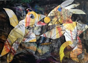 Der Untergrund „Drunten am Fluss“, darüber gelegt die beiden streitenden Vögel.