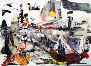 Allerdings, so leicht gebe ich nicht auf. Also dachte ich mir eine andere Szene aus, bei der ich nur sehr gelinde mit farbigen Schitzeln interveniere und dem Grund mehr Raum gebe. Vor der modernen Hafen-Kulisse spielt sich ein altertümliches Willkommensritual ab. Vielleicht funktionierte es so besser? Doch ach, auch dieses Bild ist schwer zu „lesen“ und bleibt in sich ziemlich brüchig.
