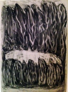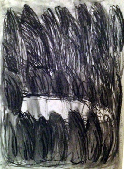 Ich bin seit drei Tagen in Athen, fern von meinem Atelier. Aber ich habe Lust zum großformatigen Zeichnen mit Kohle. Was tun? Ich kaufte mir große Pappen, die eine glatte weiße und eine raue graue Seite haben, und klebte sie an eine Wand, die graue Seite nach vorn. Ideal ist das Festkleben nicht, denn ich drehe und wende die Zeichnungen gern. Dann nahm ich eine dicke Kohle und zeichnete … einen Wald mit See.  Finster stehen Zypressen oder Pappeln ähnelnde Bäume dicht an dicht rund um die ausgesparte helle Fläche des Sees. Durch Verwischen mache ich den Wald noch undurchdringlicher.