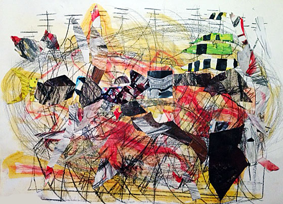 Ich meine, bei diesem Bild wird das Auge in einer Suchbewegung gehalten, wandert unaufhörlich zwischen dem gelegten „Vordergrund“ und dem gemalten „Hintergrund“ hin und her, verwebt sie miteinander, um ein Thema zu erkennen. Denn das Bild ist zwar abstrakt, aber auf Themenfindung mag kein Mensch verzichten. Schau mal auf die „Antennen“ am oberen Rand des Bildes und auf die kreisende Bleistiftbewegung rund um das zerrissene Rot. Füge das Grün hinzu, lass dich auf die dunkle Unordnung in der Mittelzone des Bildes ein und folge dem dicken schwarzen Zeiger nach unten. Von dort her erschließt sich auch ein möglicher Sinn, den ich umschreiben möchte als „Weltzustände“.