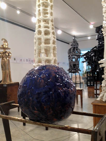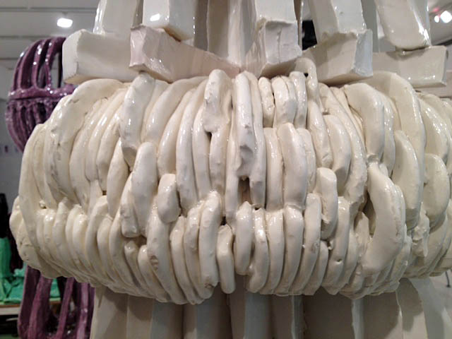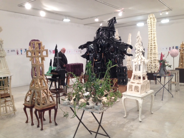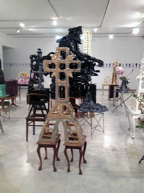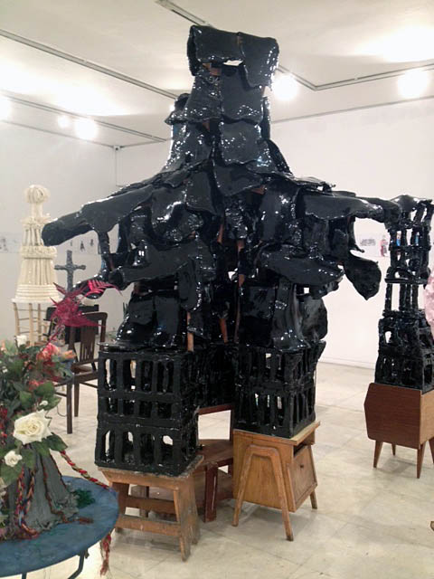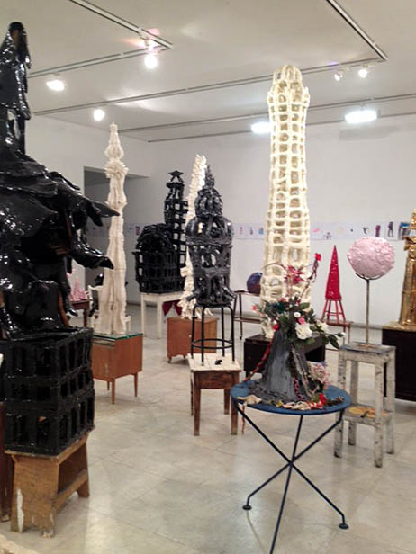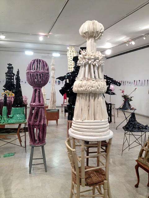 Das stellt der Künstler Nikos Tranos (Jg 1957) in seiner Installation „White Power“ dar („Work in progress“, seit 2007). Als ich die Galerie Zoumboulaki im Athener Zentrum betrat, wurde ich fast erschlagen vom Andrang bizarrer Formationen, die dicht gedrängt, hochragend und schwankend auf allerlei altmodisch-brüchigen Tischchen und Gestellen standen. Moderne Totems, dachte ich. Manche waren schwarz-glänzend, andere rosa oder unangenehm grün. Es gab auch viele weiße Gebilde, die im einzelnen betrachtet gar nicht mal hässlich waren. Aber dieses Gedränge, dies Wirrwarr, diese hypertrophen Gebilde, vergleichbar überzüchteten Gemüsen, diese Möchte-Gern der Selbstdarstellung auf schwachem Sockel – das war fast unerträglich. Es ist nicht möglich, den Anprall von Masse, den ich empfand, auf den Fotos wiederzugeben, aber dennoch: hier sind ein paar Eindrücke.