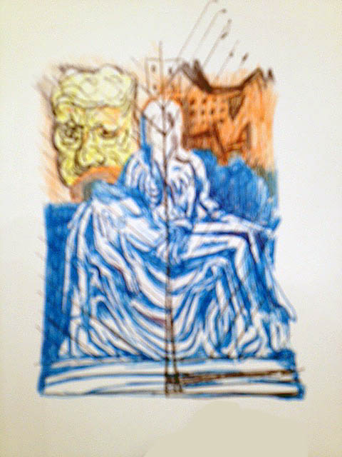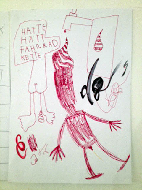 Das Material? Die Skulpturen sind aus Tonerde, Porzellan, Glasfluss, Farben, Emaille, zwei bis drei Mal gebacken bei 1000 Grad C. Die Gestelle, Hocker und Tischchen, auf denen die hypertrophen Gebilde schwankend thronen, stammen aus dem Sperrmüll, Relikte bescheidenen bürgerlichen Wohlstands. Rundum an den Wänden läuft ein „Fries“ von 250 Buntstiftzeichnungen 20×30 cm („Green Park“), viele so akkurat, als handle es sich um archäologische Zeichnungen. Sie fungieren, scheint mir, wie im antiken Drama als Chor, der die Taten der Großen kommentiert. Hier ein paar Beispiele, davon eins mit dem Spruch „Hätte, hätte Fahrradkette“, das ich kürzlich bei Ulli las. (Ein „Buch in progress“, beginnend 1944 mit einem Liebesgedicht von Andre Breton, ein Video mit der Sprengung eines Kunstgebäudes und der Briefwechsel zwischen einem griechischen Gastarbeiter in Deutschland und seiner Mutter gehören ebenfalls zur Ausstellung).