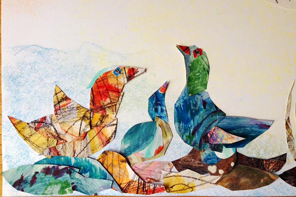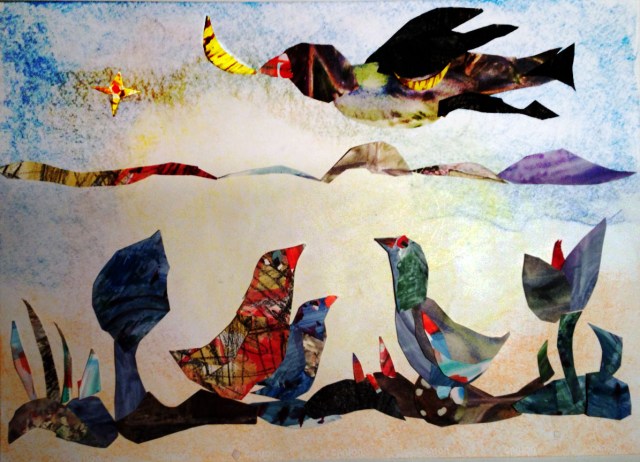 Der Vogel TUI sieht etwas gestückelt aus.  Tage haben das so an sich, man ist zerstreut, man verzeettelt sich leicht. Da das Buch aber für Babys und Kleinkinder ist,  werde ich den Tui wohl noch mal in geschlossenerer Gestalt legen. Notfalls schneide ich mir ein paar neue Stücke.