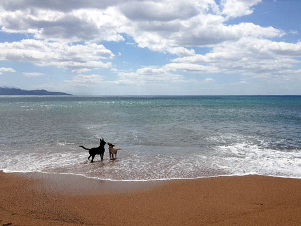 Der Kleinere ist Tito, der Große Schwarze ist ein namenloser, frei lebender Hund. Das Foto habe ich am 26. April 2016, um 18 Uhr aufgenommen.