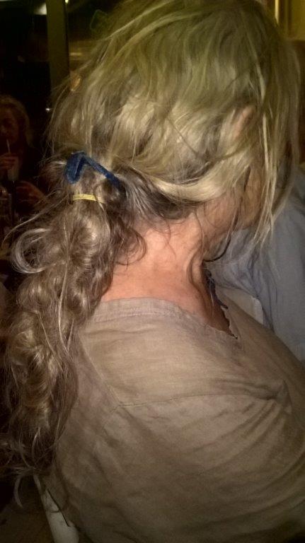 Gestern abend fragte mich A, die am Tavernentisch zufällig neben mir saß, ob sie meinen Zopf fotografieren dürfe. Ja, warum nicht? Noch feucht vom Schwimmen und verzottelt, ist er ein Kunstwerk der anderen Art. So gefalle ich mir.
