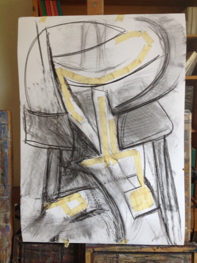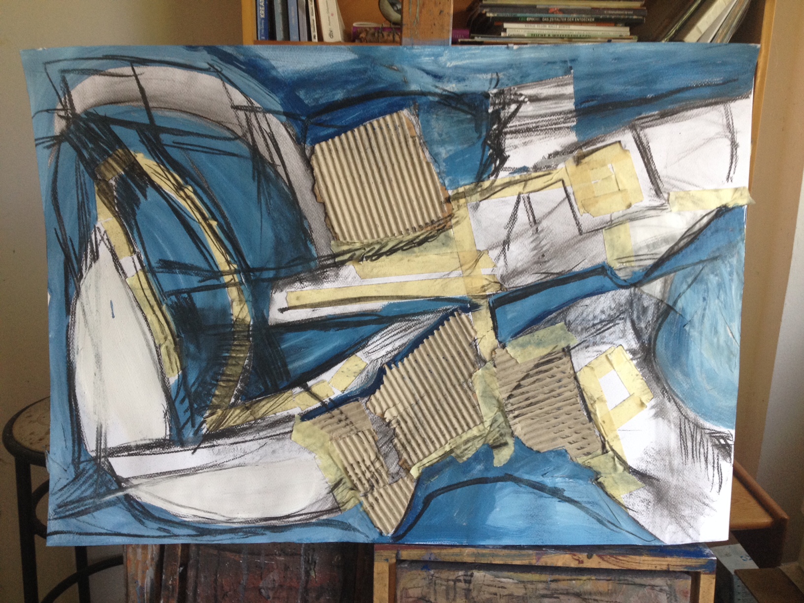 Für die Herstellung des Bildes habe ich benutzt: weißen Zeichenkarton 70×50 cm, Kohle, diverse Papiere, Klebebänder und Kleber, Akryllpigment preußischblau und weiß, Wasser