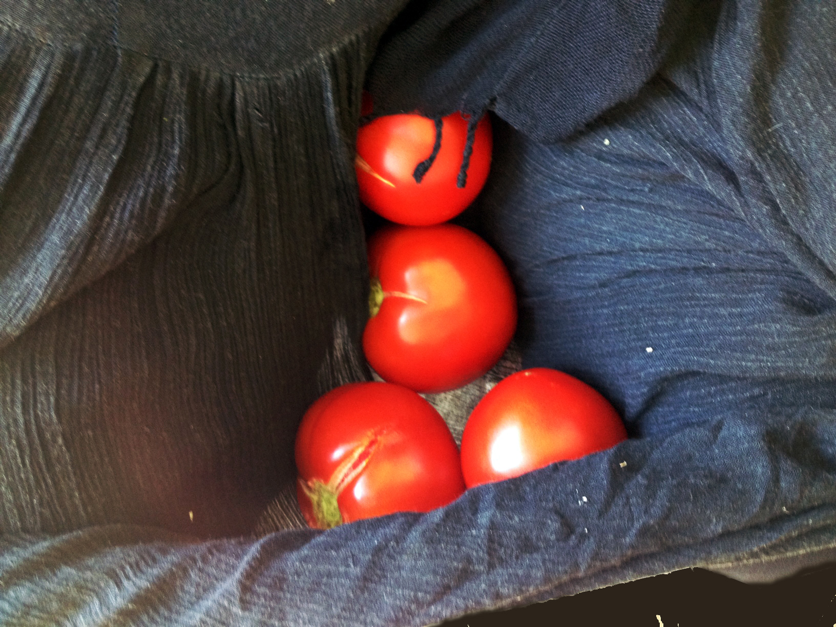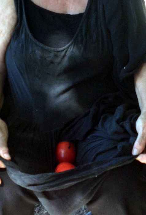 Leben: Mir gegenüber sitzt A, eine Nachbarin. In ihrem Schoß hält sie vier Tomaten, die sie für sich zurückbehalten hat. Die anderen sind in der Tüte, sie hat sie uns vorbeigebracht und geschenkt. Sie hat sie bei einem alten Mann gekauft, der einen kleinen Bakze (Bauerngarten) bepflanzt und den sie durch gelegentliche Käufe „unterstützt“. Es sind schöne sonnenreife Früchte, rot glänzen sie aus dem Schwarz ihres Kleides hervor. Ich frage sie, ob ich sie fotografieren darf. Ja. Aber nicht ihr Gesicht. Es ist ein ehemals schönes Gesicht, jetzt von allzu vielen schwarzen Gedanken zerfurcht und zermartert. Sehr zornig ist sie und sie schimpft viel auf die Menschen und ihre Verhältnisse. Aber niemals würde sie eine Tomate nehmen, um sie an einer Wand oder einem Politiker zu zerschmettern. Nein. Denn was können die Tomaten für den Unsinn der Menschen?