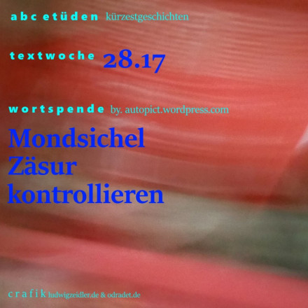 Autopict hat schneidende Wörter für die abc-etüden gespendet: Mondsichel und Zäsur, dazu auch noch das nicht weniger schnittige Wort kontrollieren. Und wir armen ABC-Schützen sollen daraus auf Christianes Wunsch hin eine Kürzestgeschichte basteln.