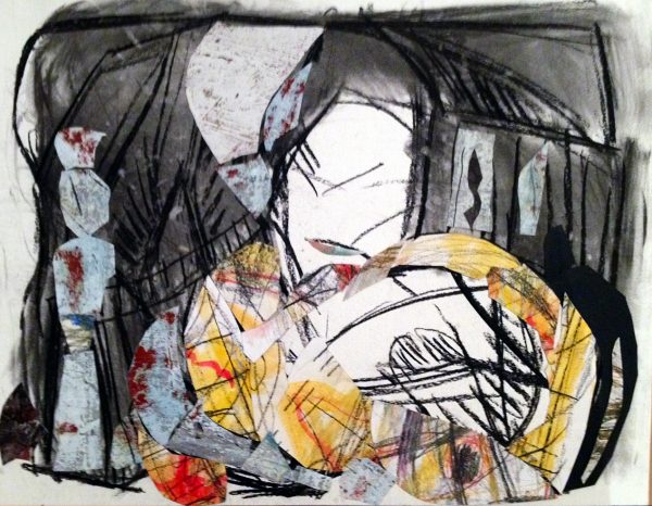 Die Kohlezeichnung, die mir als Grundlage für die „Chinesin“ diente (50 x 65 cm), benutzte ich gestern noch zwei mal für neue Arbeiten, dazu auch dieselben farbigen Schnipsel. Zur Erinnerung: