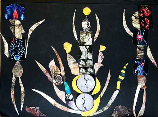 Zur Technik: außer meinen bemalten Papier- und Pappeschnipseln habe ich aus einer medizinischen Broschüre ausgeschnittene Fotos eingebaut.