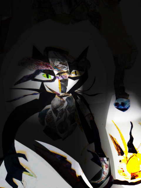 Oben seht ihr Katze und Kater beim hoffnungsvollen Rendevouz, als Aquarell. Unten seht ihr einen glutäugigen Kater am Feuer, Legearbeit, Detail, ein wenig elektronisch dramatisiert.