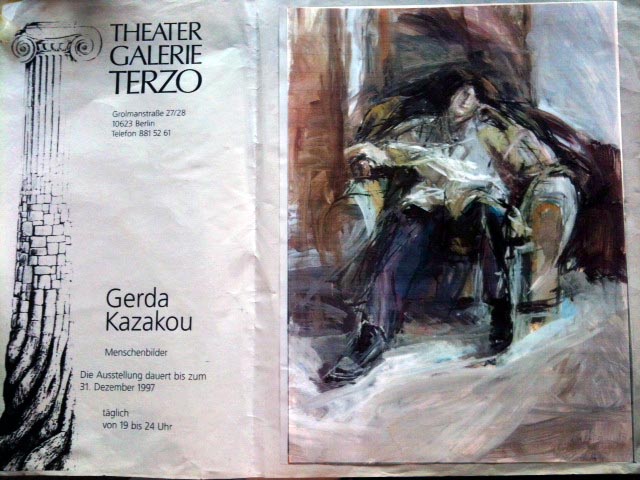 Meine sehr geliebte Freundin Yvonne Stangou organisierte vor genau zwanzig Jahren eine Ausstellung für mich in Berlin. Yvonne lebt nicht mehr, und ich weiß nicht, ob die Galerie noch existiert, denn ich war seither nicht mehr in Berlin. Vielleicht kennt ja einer oder eine von euch noch „Terzo Mondo“ in der Grolmannstraße und erinnert sich an die angeschlossene Galerie, die die Frau von „Kostas dem Griechen“ führte? Ein Foto vom Ausstellungsplakat fiel mir heute in die Hände, und da ich nichts Neues gemalt habe, möchte ich es euch zeigen.