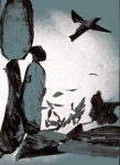 Rechts die gespannte Haltung, Wind wirbelt die Blätter auf, die Taube fliegt und kehrt wieder