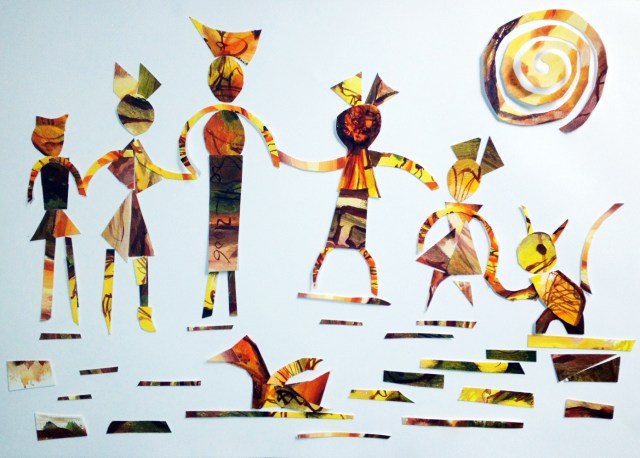 Draußen herrschen Regen und Düsternis. Da leuchten Susannes Schnipsel doppelt verführerisch. Afrikanisches gestaltet sich: eine Familie – die Mutter und die vier Töchter – haben sich Schleifen ins Haar gebunden für die sonntägliche Promenade. Die Sonne schickt ihre Strahlen heiß zur Erde. Da ist das Wasser mit der plätschernden Ente eine Wohltat. Aber rein dürfen die Mädchen nicht, leider. Solche Vergnügen sind nicht für die Kinder der neuen Mittelklasse. Wozu hat man sich so fein gemacht?