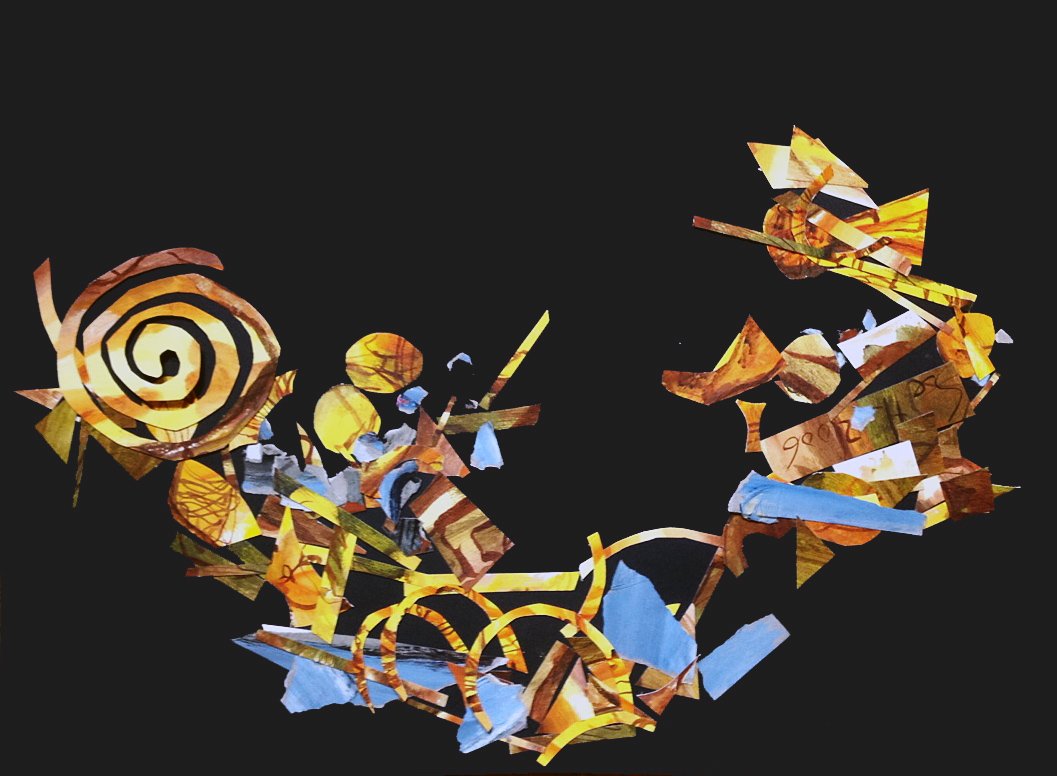 Was ich gestern nicht gesehen habe, habe ich heute erfunden. Dafür brauchte ich sämtliche gold-rot-braunen Teile von Susanne, ein paar blaue gerissene Schnipsel von mir und eine schwarze Pappe im Format 50 x 70 cm als Legegrund. Nun, und ein bisschen Fotoshop habe ich auch eingesetzt. Ihr seht im ersten Bild den Feuerwerker in Aktion, es folgen zwei Bildausschnitte, damit ihr die Leute auf der Brücke, die das Spektakel betrachten, besser erkennen könnt, dann nochmal das ganze Bild, diesmal ohne Fotoshop-Effekte (bitte die Bilder anklicken).