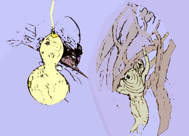 Madame Kolokytha und das Wurzelmännlein könnten ein so schönes Paar sein; in den Hölzern, die ihn umzingeln, sieht er nun so hilfeflehend aus