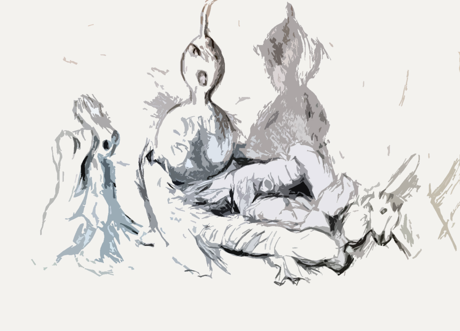 Von meiner Wanderung am Gialova-See brachte ich einen Beutel mit Beutestücken mit, darunter etliche Schilfwurzelmännchen. Meine Idee war, diese entwurzelten, an Land gespülten Gestalten, diesen „Auswurf“ also, erst als wüsten Haufen, dann einzeln zu zeichnen, um ihre jeweilige Besonderheit und Individualität, ihr persönliches Schicksal sozusagen, zu ehren. Etwa so: