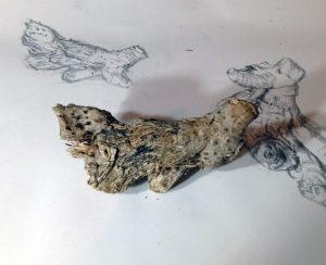 Und nun zeige ich noch mal Original und Zeichnung in Einzelaufnahmen: zuerst die beiden inzwischen „Alteingesessenen“, dann das neu angeschwemmte Volk, noch ein wenig nass, zerzaust und sandig, wie ich es einsammelte, aber doch schon auch ein wenig eingewöhnt. Voila!