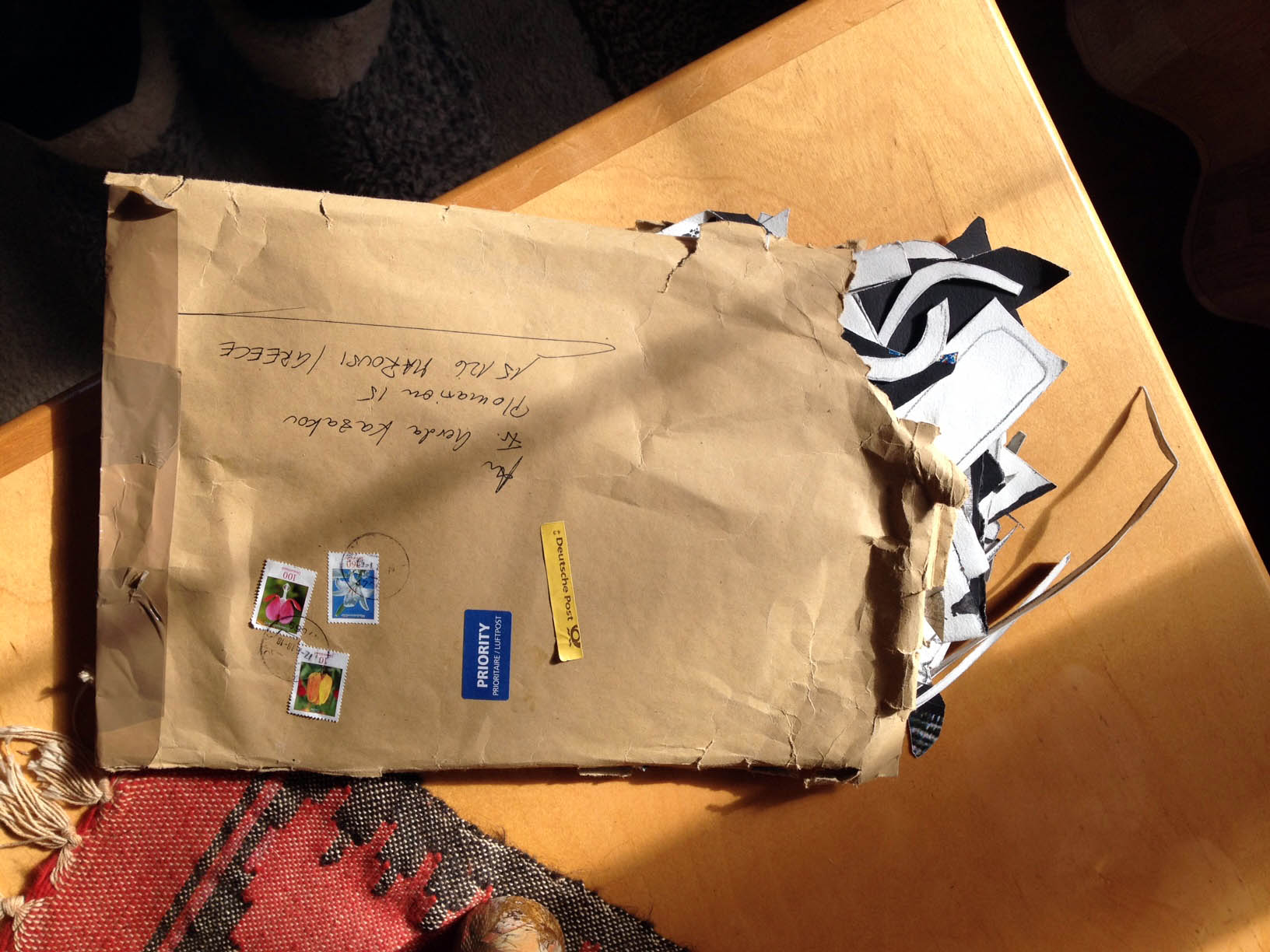 Jürgen Küster, vom Bucholov Blog, hat mir die Überbleibsel seiner Scherenschnitte geschickt. Der Umschlag DINA4 kam heute mit der Post, an der Seite klaffte eine große Öffnung. Doch der Inhalt war intakt: